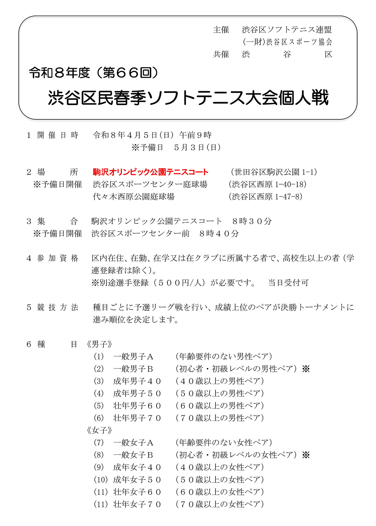 令和8年度 第66回渋谷区民春季ソフトテニス大会個人戦 要項